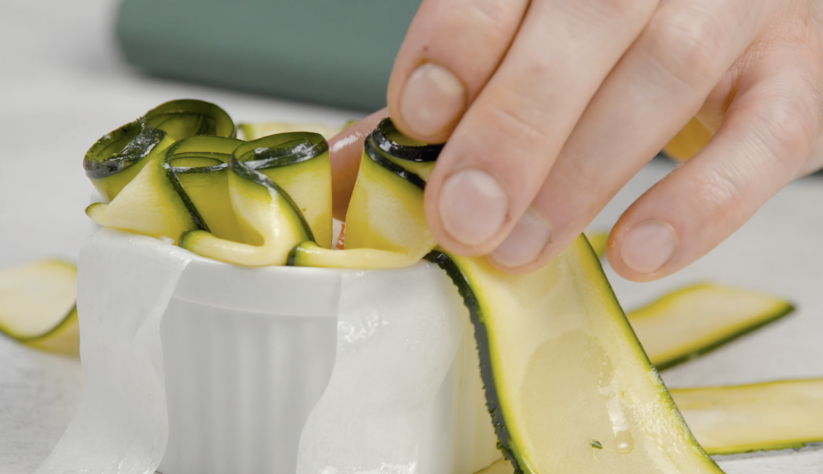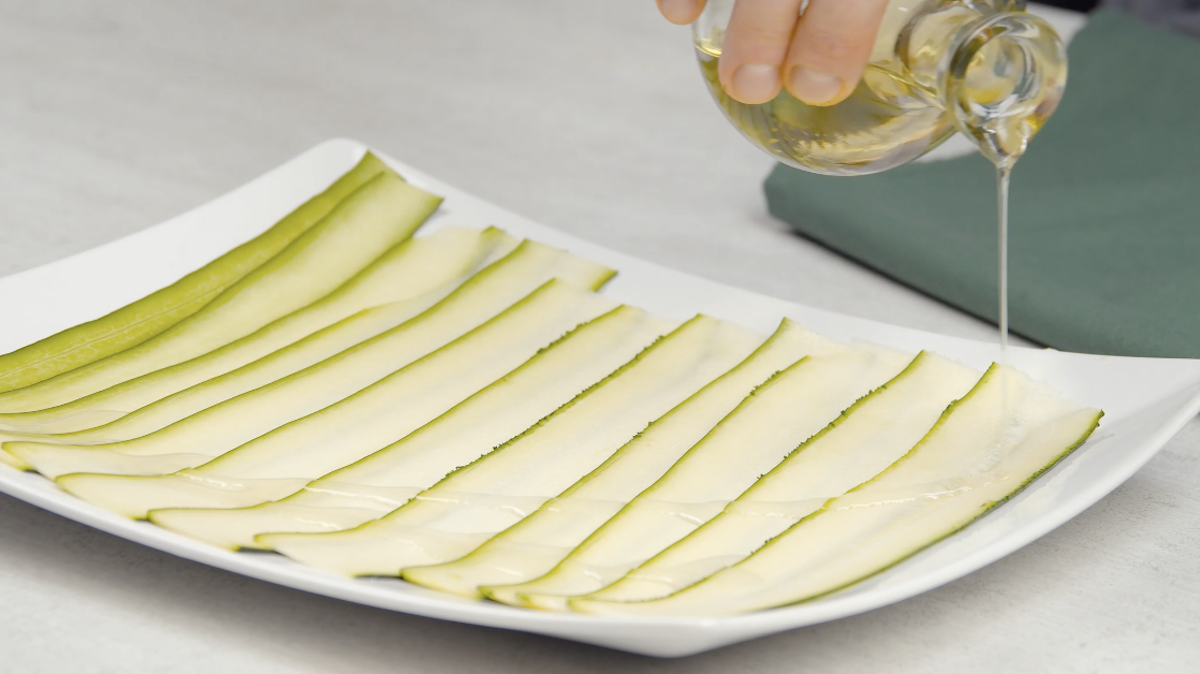 3. Für den Zucchinimantel schälst du die Zucchini mit einem Sparschäler in lange dünne Scheiben und marinierst sie mit Pflanzenöl, Salz und Zucker.