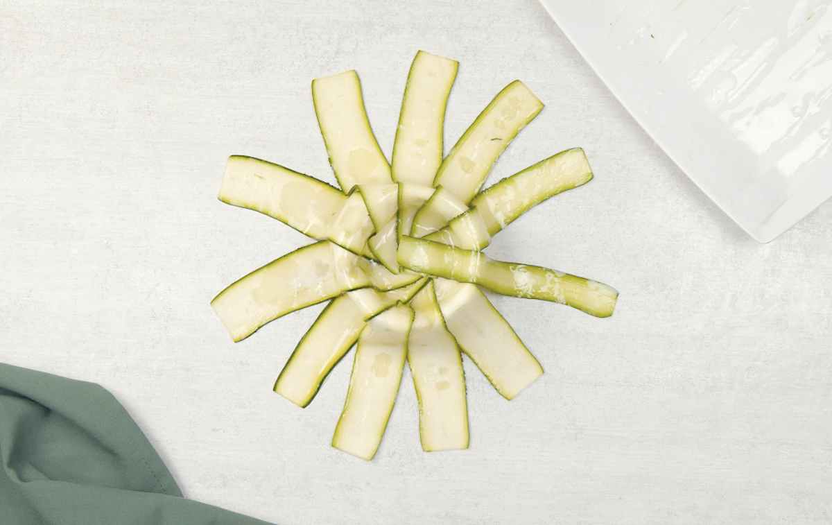 4. Lege eine kleine Keramikschale mit zwei über Kreuz gelegten Streifen Backpapier aus und ordne dann die Zucchinischeiben im Kreis an.