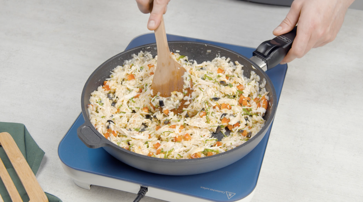5. Fülle die Schale mit der Hähnchen-Risotto-Füllung (ca. 0,5 cm zum Rand frei lassen).