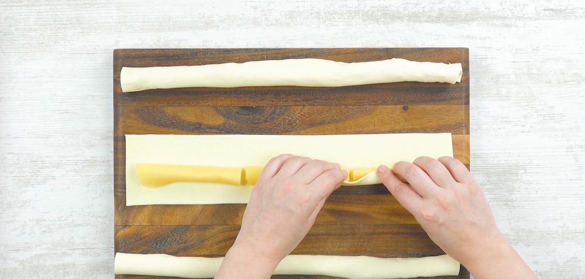 6. Verteile auch die Käsescheiben in drei Reihen auf einem Blätterteig, schneide diesen in Scheiben und rolle sie samt Käse ein.