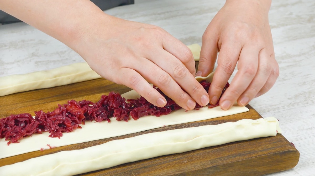 4. Verteile den Rotkohl ebenfalls in drei Reihen auf einem weiteren Blätterteig, schneide diesen in Streifen und rolle wiederum diese samt Rotkohl ein.