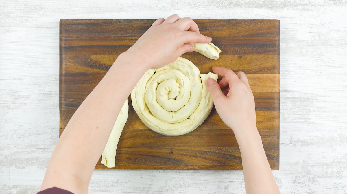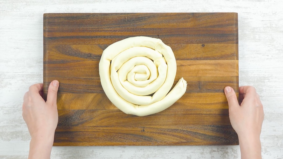 7. Verbinde die mit Käse gefüllten Blätterteigrollen ebenfalls zu einer Schnecke.