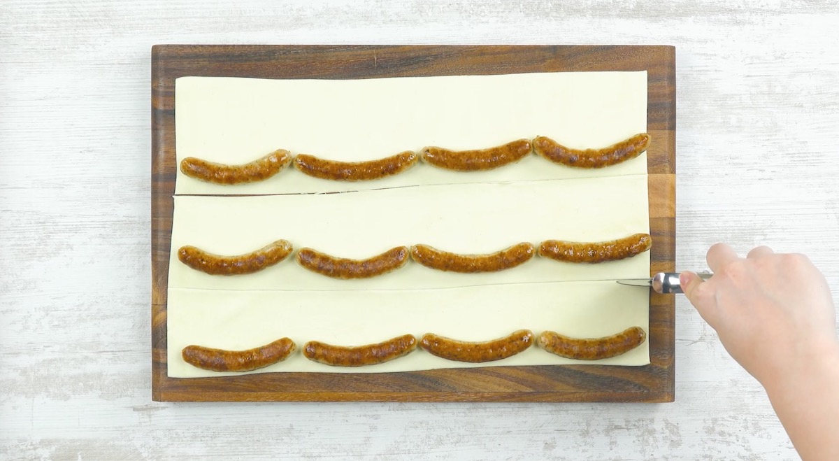 So geht es: 1. Brate alle 18 Bratwürstchen in einer Pfanne an, lege sechs davon jedoch zunächst beiseite, verteile die verbleibenden zwölf dann in drei Reihen auf einem Blätterteig und schneide diesen in drei gleich breite Streifen; achte darauf, dass die aufgereihten Würstchen je neben einer Schnittkante liegen.