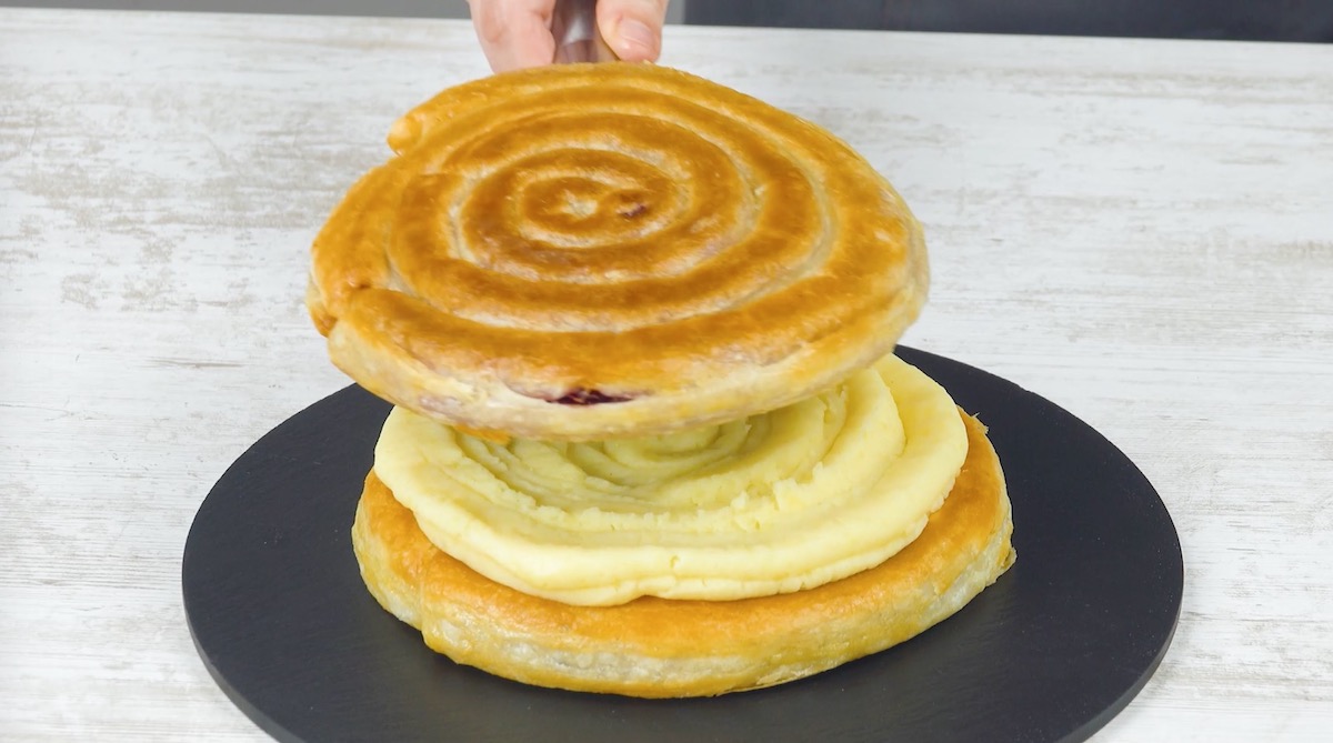 10. Bespritze auch diese Blätterteigschnecke mit Kartoffelpüree und bedecke sie mit der mit Käse gefüllten Schnecke. Verziere diese oben mit Rosetten aus Kartoffelpüree. Schneide die Enden der übrigen sechs Bratwürstchen schräg ab, setze sie zu kleinen Herzen zusammen und dekoriere mit ihnen den herzhaften Kuchen. Fixiere die Herzen bei Bedarf mit Zahnstochern.