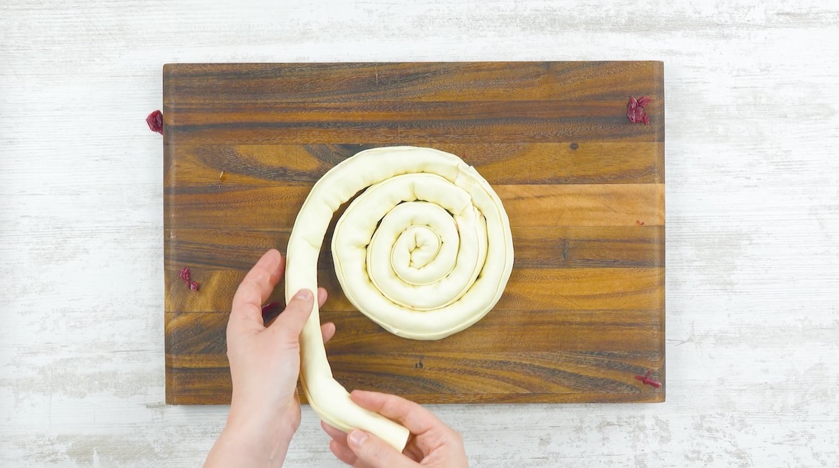 5. Verbinde die mit Rotkohl gefüllten Blätterteigrollen ebenfalls zu einer Schnecke.