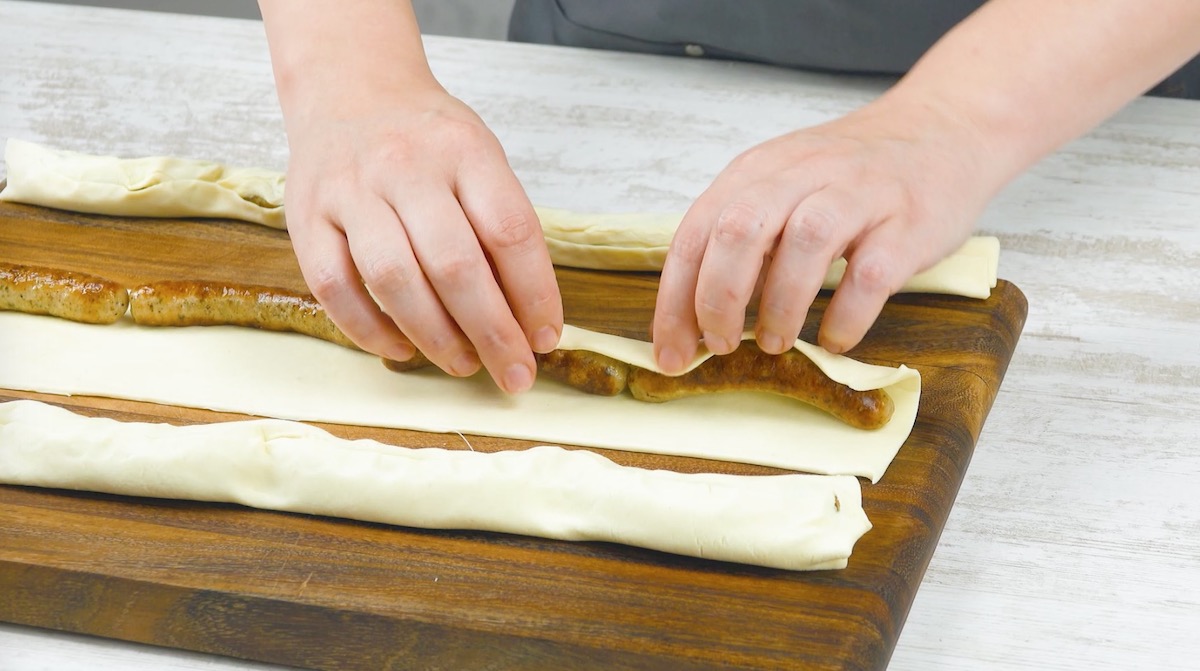 2. Rolle die Bratwürstchen in den Blätterteig ein.