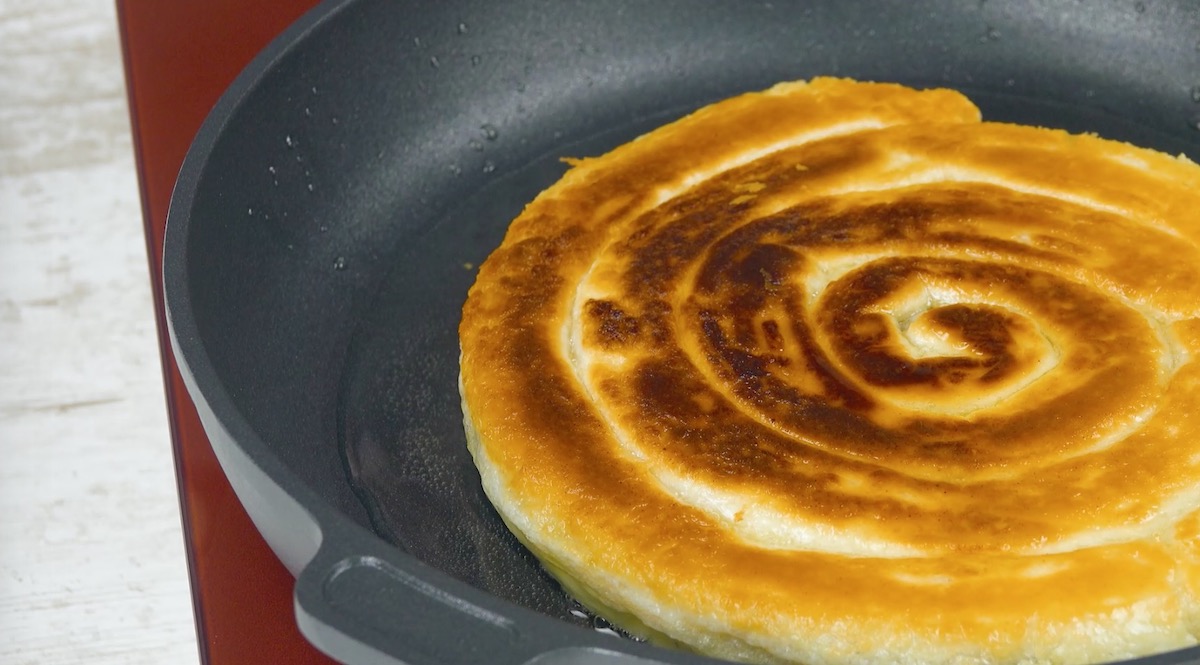 8. Brate jede Schnecke von beiden Seiten an, bis sie goldbraun ist. Tipp: Friere die Blätterteigschnecken vor dem Braten kurz ein, dann lassen sie sich in der Pfanne leichter wenden.