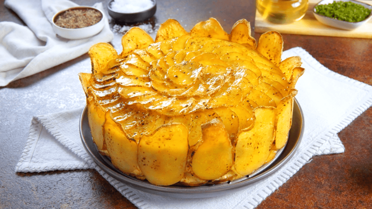 Dieser herzhafte Kartoffelkuchen schmeckt wie ein köstlicher Kartoffelauflauf, sieht aber eher wie eine Torte oder ein Kuchen aus. Außerdem bleibt er durch die Sahne-Ei-Mischung herrlich saftig. Ein Kartoffelgenuss, den man nicht mehr vergessen kann.