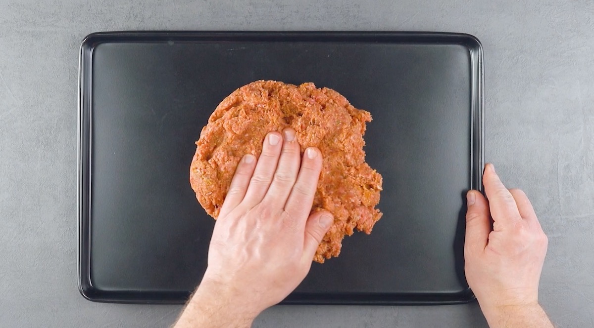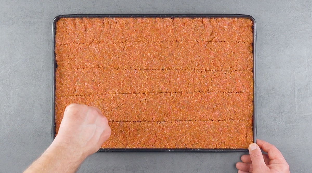 1. Vermenge das Hackfleisch mit den angegebenen Zutaten und verteile es anschließend gleichmäßig auf einem eingefetteten Backblech; die Fleischschicht sollte ca. 1 cm dick sein. Decke das Blech dann mit Folie ab und stelle es für zwei Stunden in den Tiefkühler.