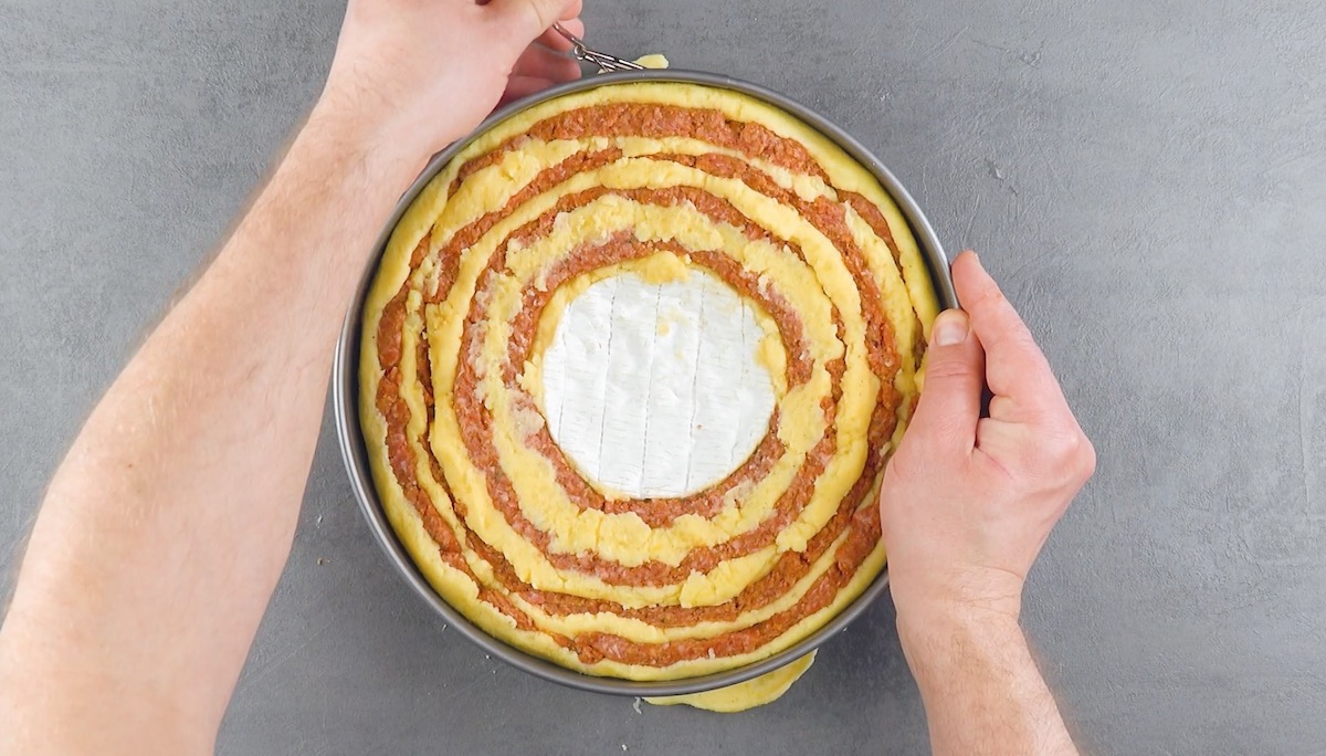 Wird ein mehrlagiger Kuchen serviert, liegen die Schichten eigentlich übereinander. Doch ein Kuchen lässt sich auch schichten, indem die verschiedenen Lagen sich gegenseitig umhüllen. Am besten funktioniert das mit einem herzhaften Kuchen – unser Exemplar vereint würziges Hackfleisch mit einem aromatischen Kartoffel-Brandteig und überrascht in der Mitte mit einem geschmolzenen Kern aus Camemberts.