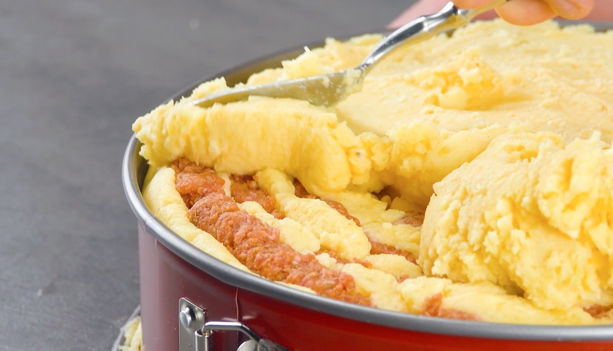 9. Bedecke den herzhaften Kuchen gleichmäßig mit dem restlichen Kartoffel-Brandteig.