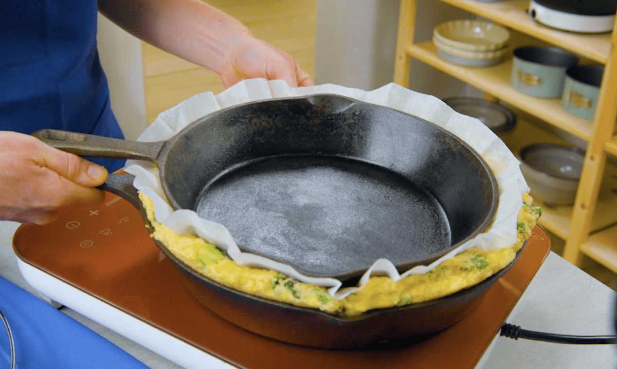 7. Lege ein Stück Backpapier auf die Kartoffelmasse und drücke dann mit einer kleineren Pfanne eine Mulde in die Kartoffelmasse. Lass die Kartoffelmasse in der Pfanne ca. 10 Minuten bei schwacher Hitze anbraten, bis sie am Rand knusprig geworden und der Käse geschmolzen ist.