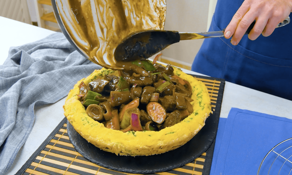 8. Platziere den Kartoffelkuchen auf eine Servierplatte oder einen großen Teller und gib die Gemüse-Fleisch-Mischung hinein.