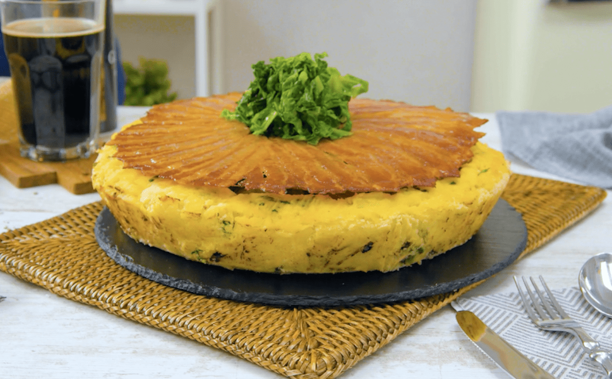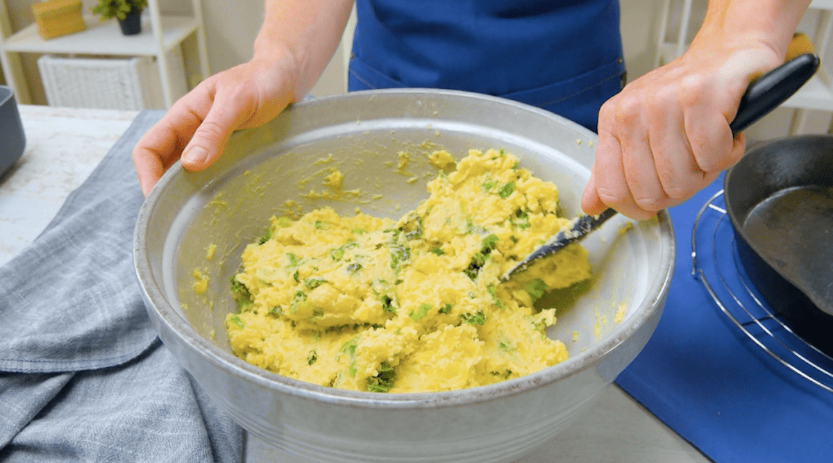 TIPP: Nach 5 Minuten braten, kann die Pfanne mit der Kartoffelmasse auch weiter im Ofen gegart werden (160 °C Umluft für 20 Minuten); so gart er gleichmäßig und bekommt eine schöne Farbe. Danach für 10 Minuten bei Zimmertemperatur auskühlen lassen, so wird der Kuchen etwas fester und lässt sich leichter weiterverarbeiten.