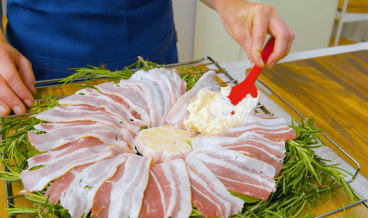 1. Schlage die Butter schaumig. Lege die halbierte Knoblauchknolle auf einen Ofenrost und lege drumherum ein Nest aus frischem Rosmarin, Thymian und Lorbeerblättern. Verteile außerdem den Bacon ringförmig um den Knoblauch. Verstreiche dann die Butter auf dem Bacon. Der Rost kommt mitsamt dem Kräuter-Bacon-Ring in die oberste Schiene des Backofens.