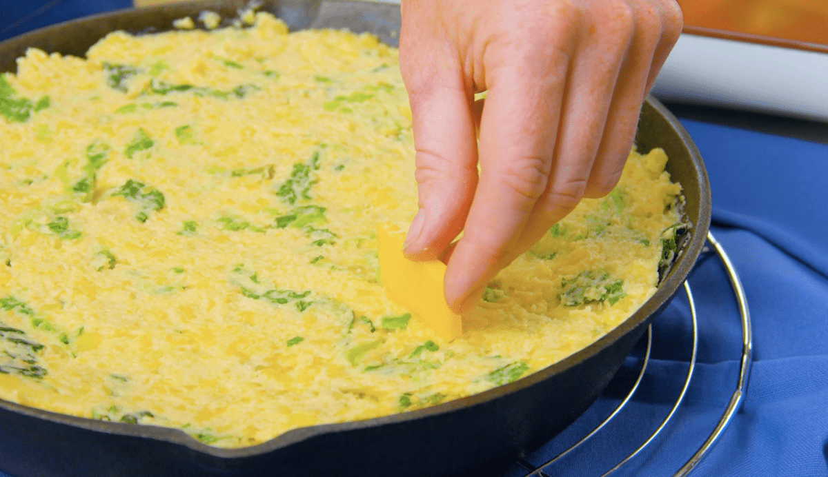 6. Bringe Butter in einer großen Pfanne zum Schmelzen und verteile darin die Kartoffelmasse. Streiche alles glatt. Schneide den Cheddar mit einem Eierschneider in gleichmäßig dicke Scheiben und drücke die Scheiben in gleichmäßigen Abständen in die Kartoffelmasse in der Pfanne.