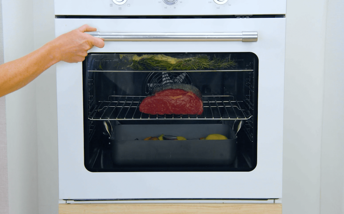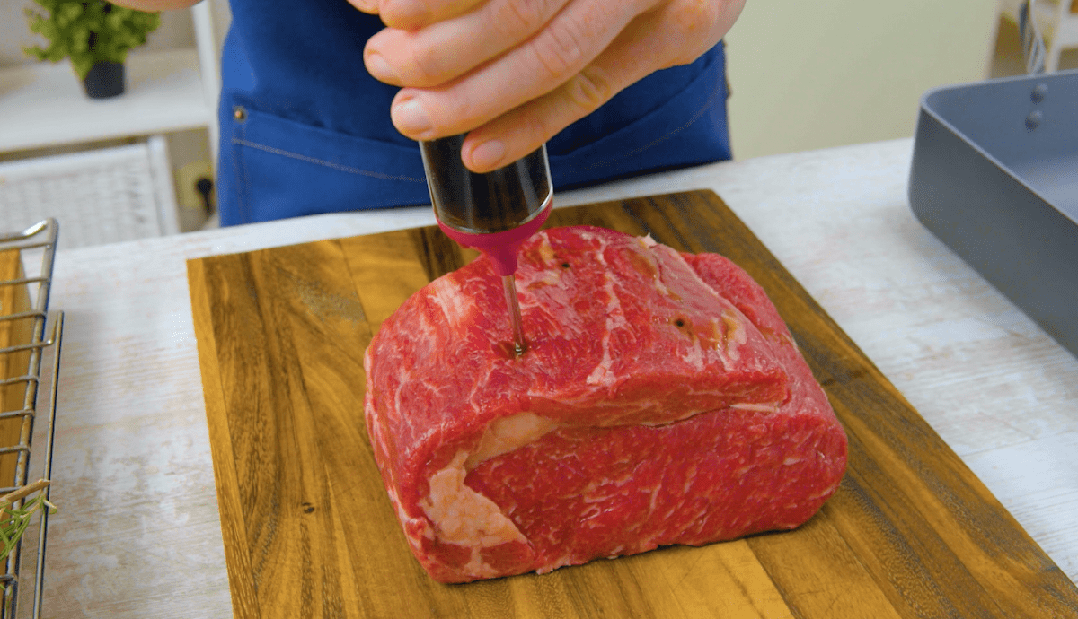 2. Spritze Guinness-Bier in das Rindfleisch und reibe es von allen Seiten mit Salz ein. Lege das Fleisch auf einen Rost in der mittleren Schiene des Ofens.