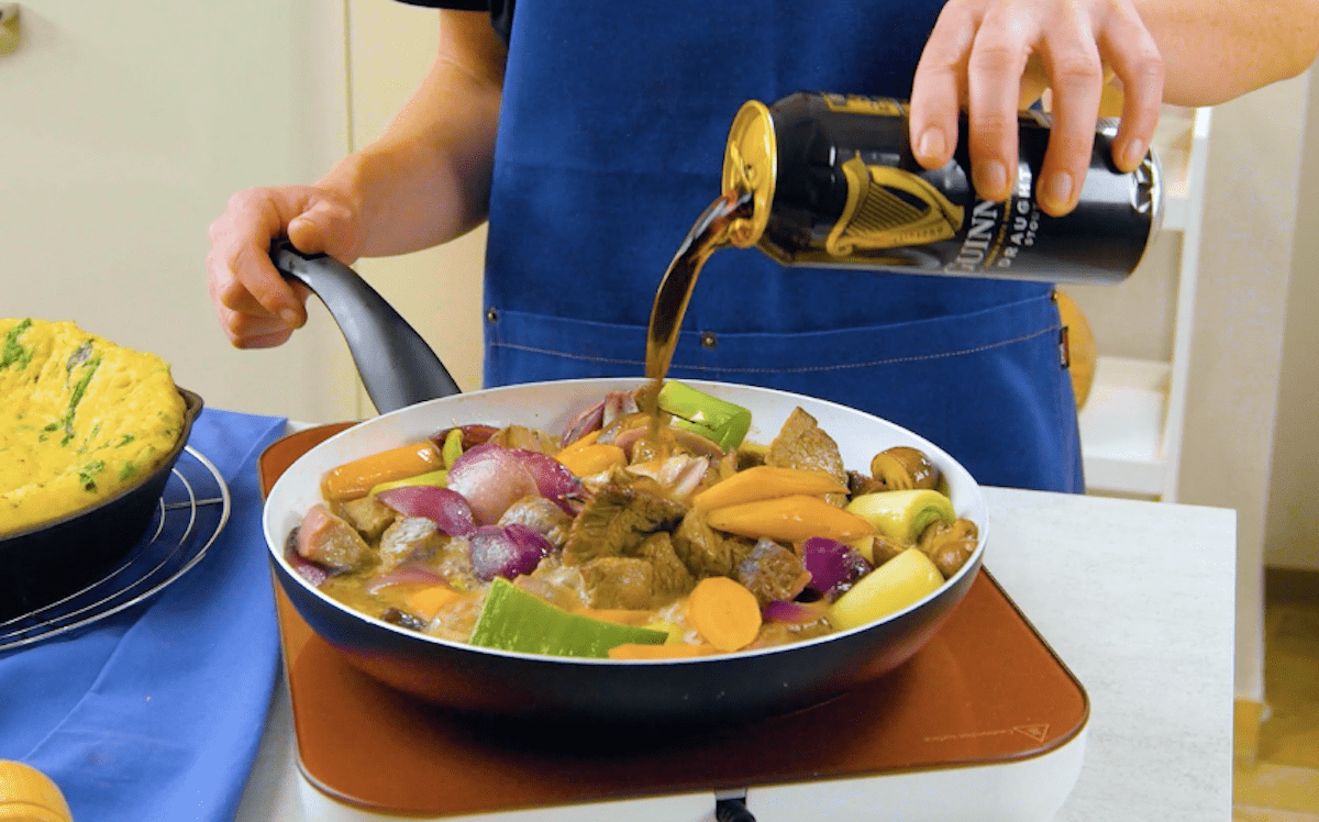 4. Gib das gegarte Gemüse (außer die Kartoffeln) in eine heiße Pfanne und füge etwas vom Fettsaft aus der Auflaufform hinzu. Brate das Gemüse kurz an und gib dann das in Würfel geschnittene Fleisch hinzu. Gieße Whiskey darüber und flambiere das Ganze (Vorsicht, Brandgefahr!). Lösche mit Guinness und Bratensaft aus der Auflaufform ab. Koche alles ca. 2 Minuten weiter, bis die Soße eingedickt ist.