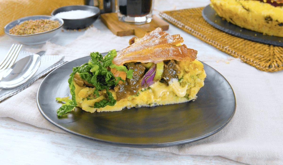 9. Lege den gebackenen Bacon-Ring vorsichtig auf den nun fast fertigen Shephard’s Pie und verteile obendrauf noch den beiseite gestellten Wirsing.