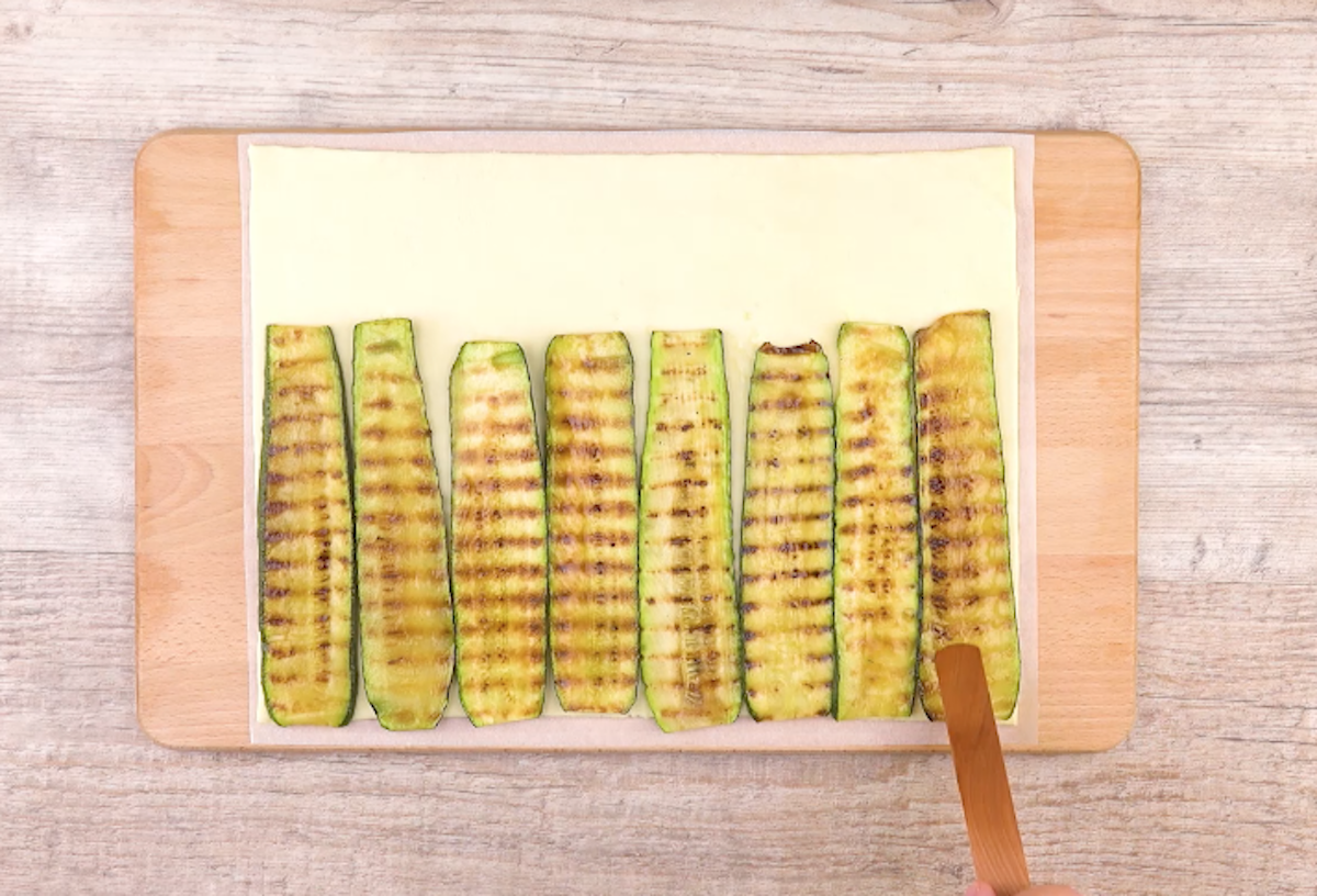 2.) Lege sie nun hochkant entlang der Längsseite auf den ausgebreiteten Blätterteig. Am oberen Ende des Teigs sollten noch einige Zentimeter frei bleiben.
