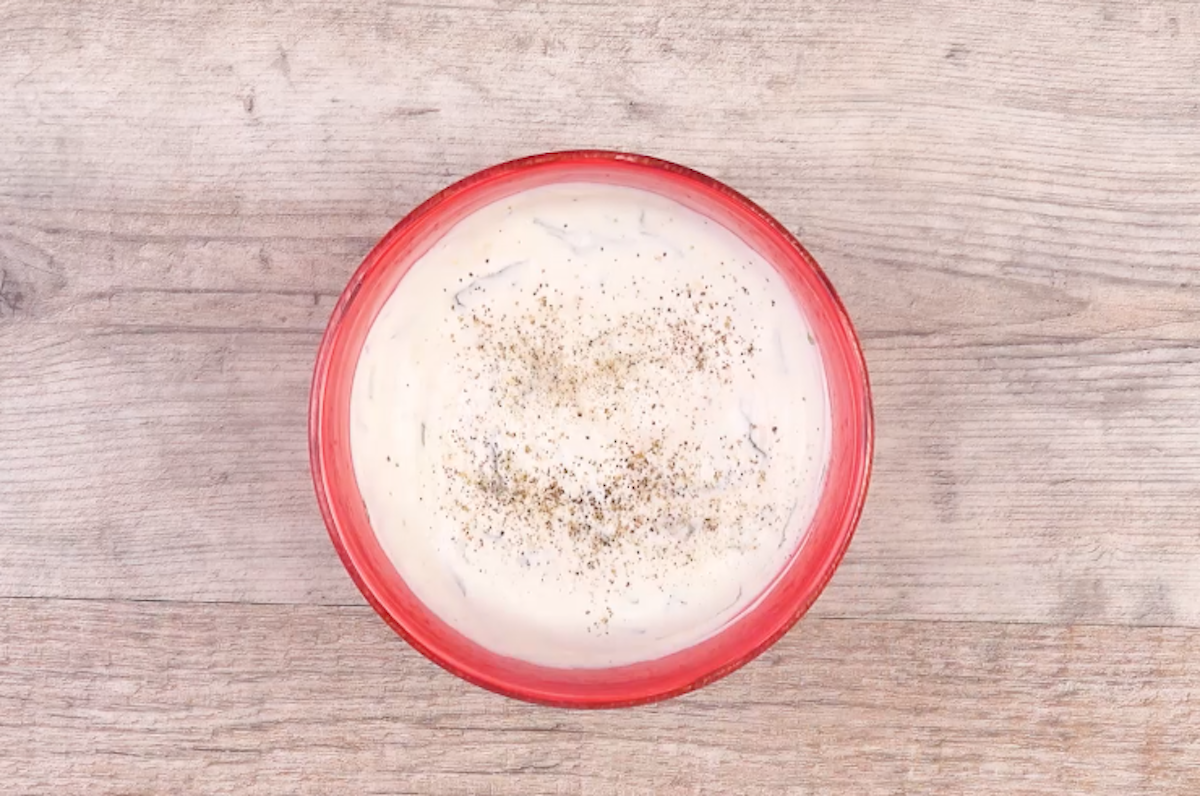 6.) Für die Joghurtsoße vermengst du den Joghurt lediglich mit dem Zitronenabrieb und der Minze und schmeckst das Ganze mit Salz und Pfeffer ab.