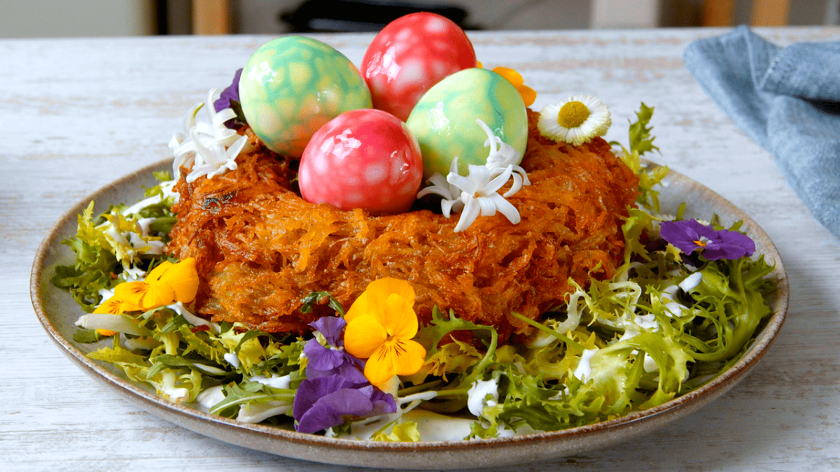 Ohne ein hübsches, reich bestücktes Osternest ist das traditionelle Osterfest kaum vorstellbar. Dieses Jahr besteht es allerdings weder aus Gräsern, noch ist es mit verschiedenen Süßigkeiten gefüllt: Wir präsentieren ein herzhaftes Osternest aus geriebenen Kartoffeln und bunten Eiern, das auf knackigem Salat ruht und mit hübschen Blumen verziert ist – davon bleibt garantiert kein Krümel übrig!