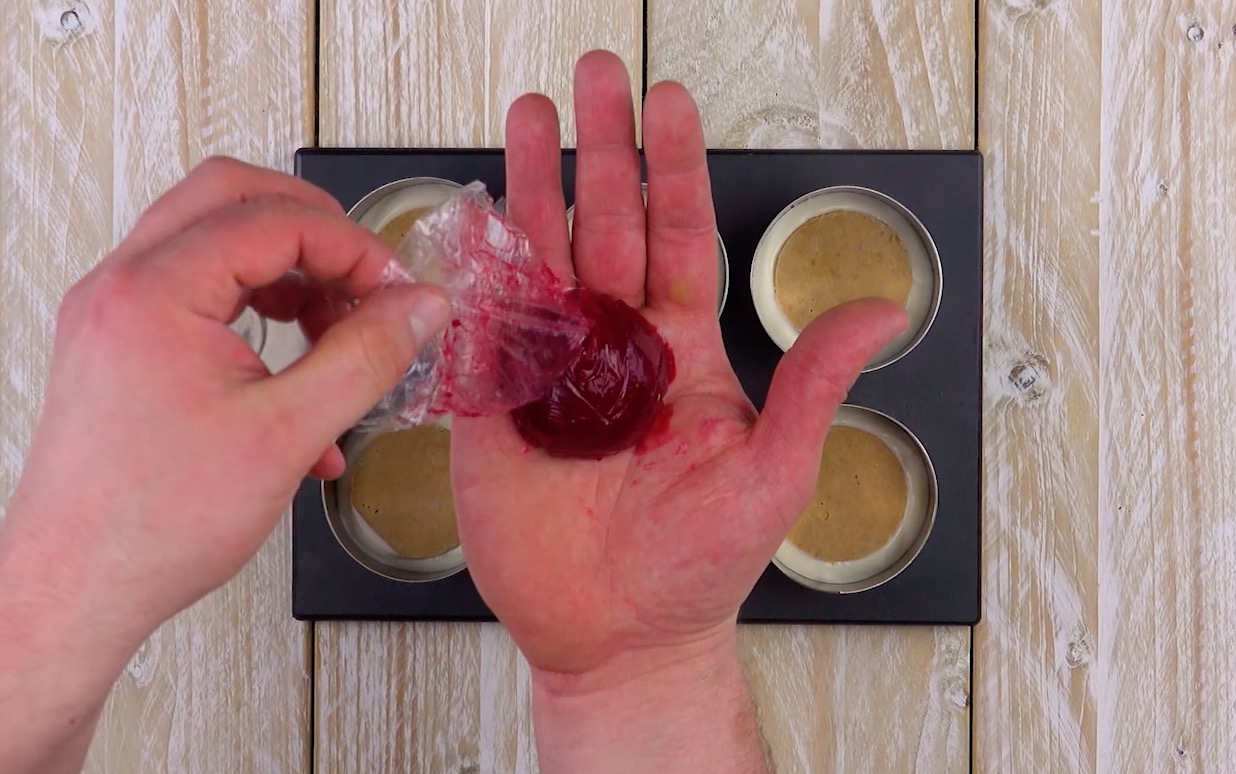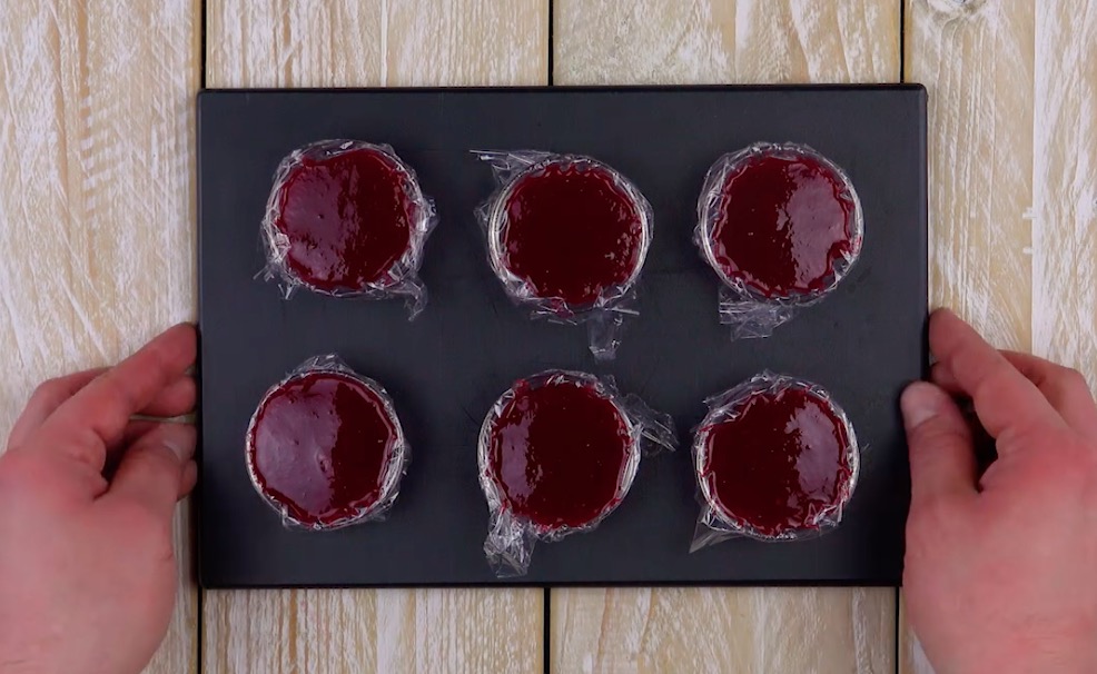 2.) Kleide dann 6 Schüsselchen mit Frischhaltefolie aus und gieße die Fruchtsoße hinein. Stelle die Förmchen für 30 Minuten in den Eisschrank.