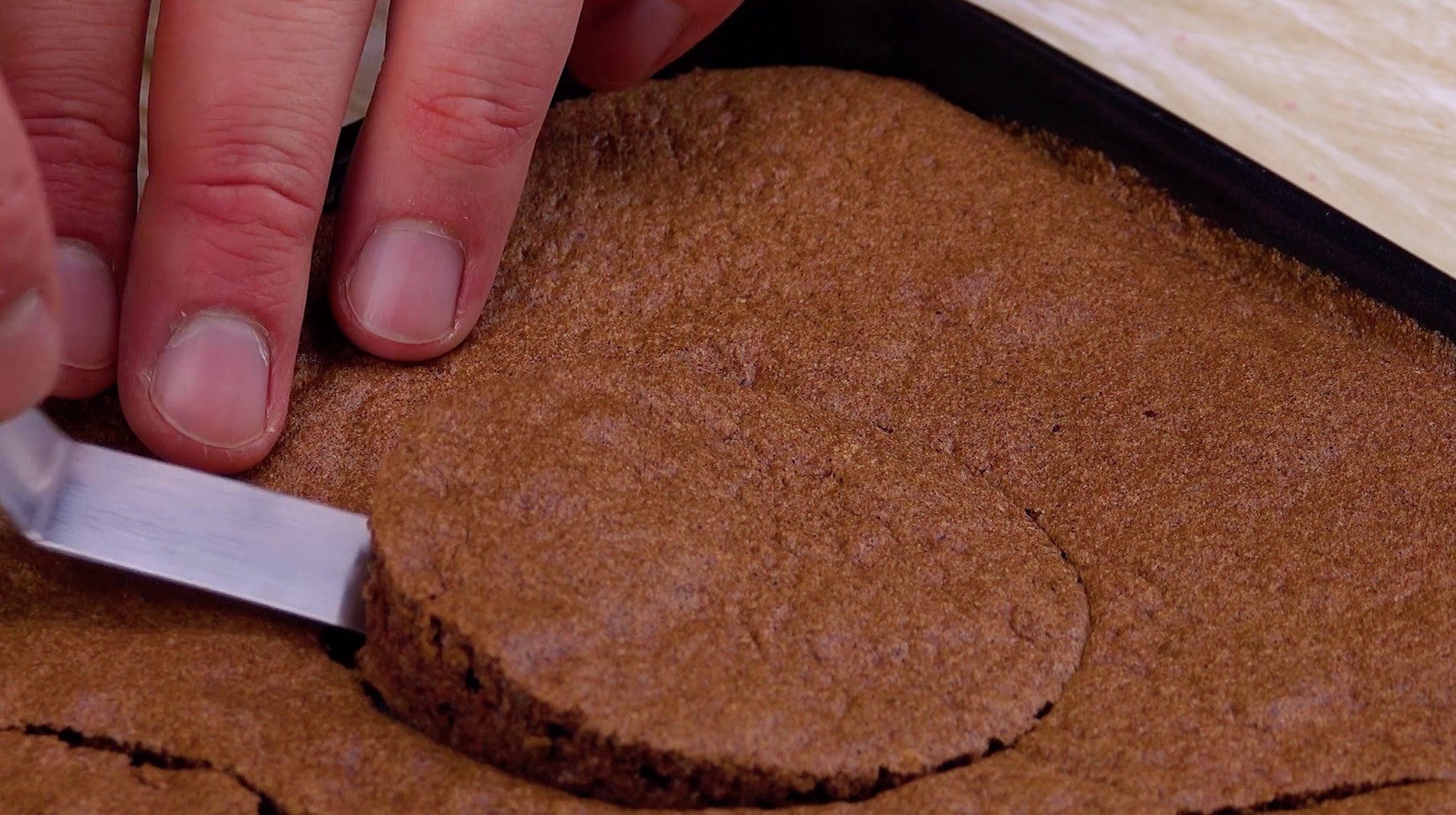 3.) Stich dann mit einer runden Ausstechform (Durchmesser: 7,5 cm) 6 Ringe aus dem Biskuitboden. Löse diese vorsichtig vom Boden und setze sie jeweils in einen Dessertring (Durchmesser: 7,5 cm).