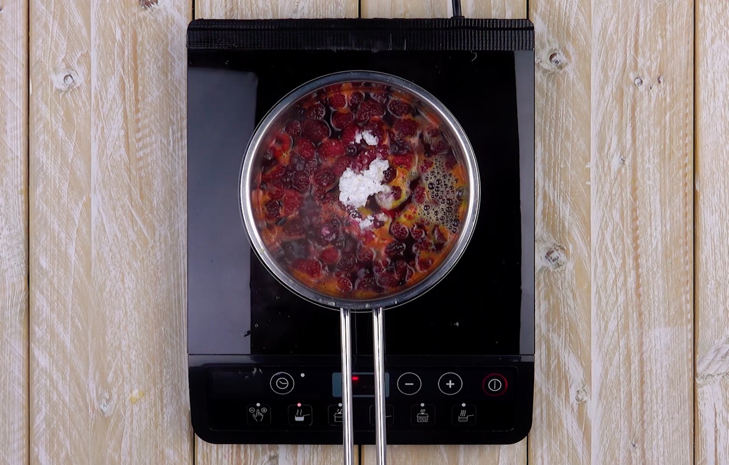1.) Erhitze die Himbeeren zusammen mit dem Puderzucker und dem Orangensaft in einem Topf und lass alles 5 Minuten kochen. Mixe anschließend alles mit einem Pürierstab und streiche es durch ein Sieb.