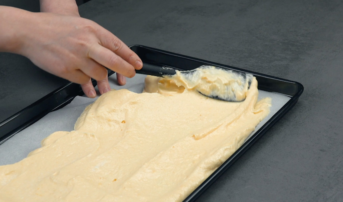 3. Lege ein Backblech mit Backpapier aus und verteile den Biskuitteig gleichmäßig darauf. Backe den Teig nun etwa 10 Minuten bei 200 °C Ober- und Unterhitze. Decke den gebackenen Biskuitteig mit einem Küchentuch ab und lasse ihn abkühlen.