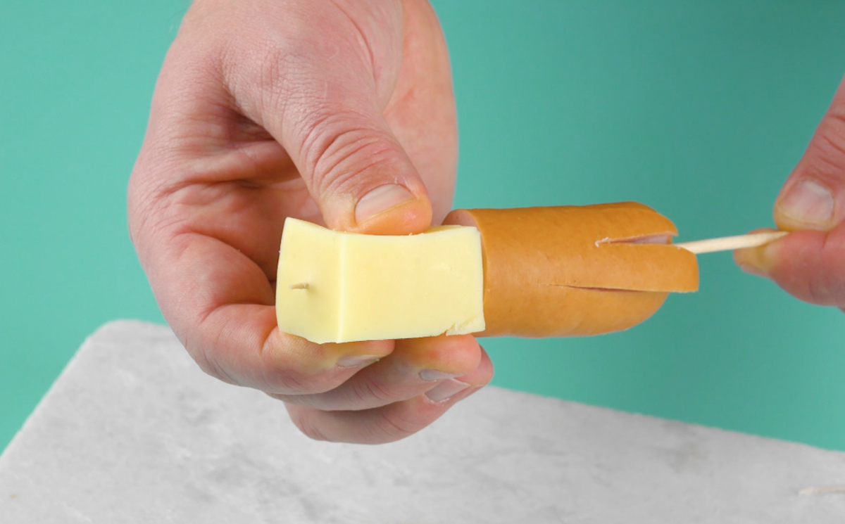 3.) Schneide den festen Mozzarella in gleich große Stücke. Spieße die Wursthälften jeweils einzeln auf ein Holzstäbchen und schiebe von der anderen Seite ein Stück Mozzarella auf das Stäbchen.