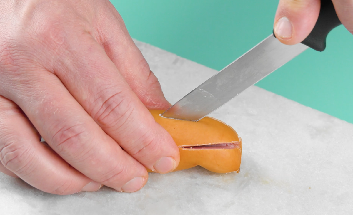 2.) Halbiere die Wurst und schneide sie an den Enden an mehreren Stellen bis zur Hälfte ein.