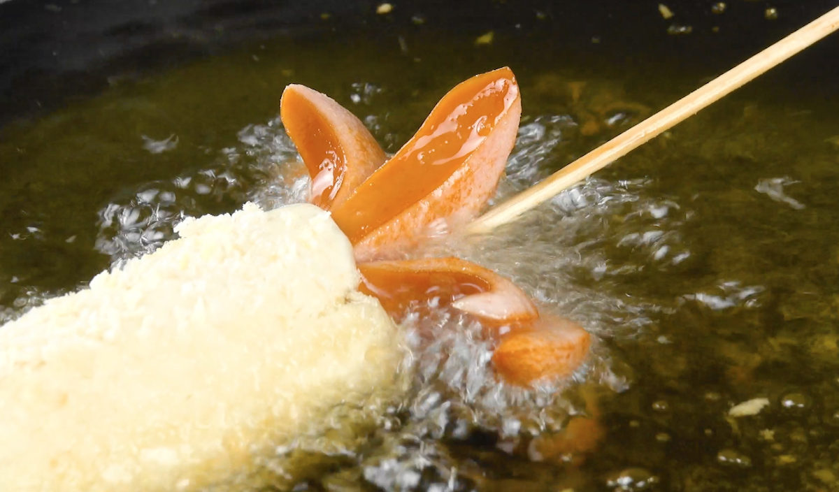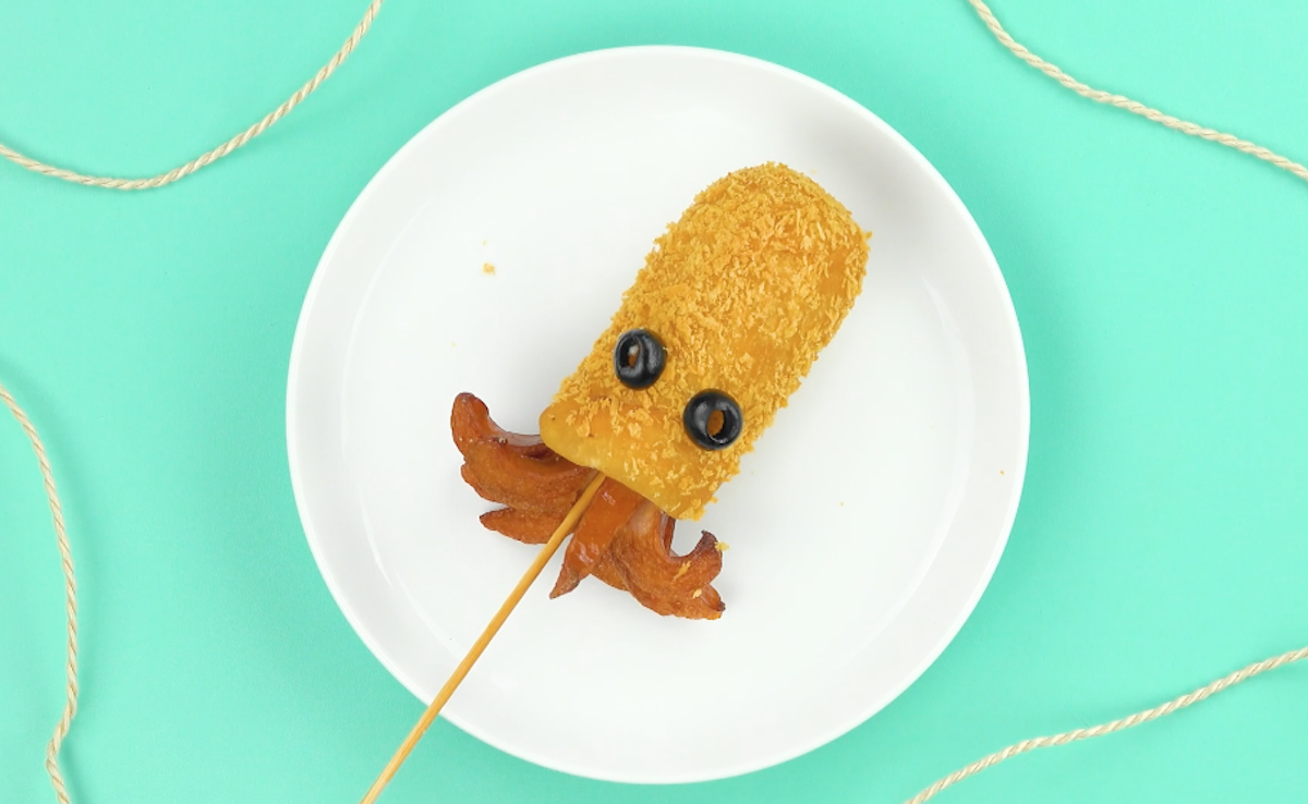 Ein Hotdog eignet sich eigentlich immer als Snack für zwischendurch. Ob bei IKEA oder in der eigenen Küche – das beliebte Fastfood ist rasend schnell zubereitet und schmeckt verboten gut. Wenn ihr also große Fans von Hotdogs seid, dann müsst ihr folgendes Rezept unbedingt ausprobieren. In dieser Variante wird das Würstchen samt Käse in Teig eingewickelt und frittiert. Die Krönung ist am Ende der Look – der frittierte Hotdog sieht aus wie ein kleiner Krake am Spieß.