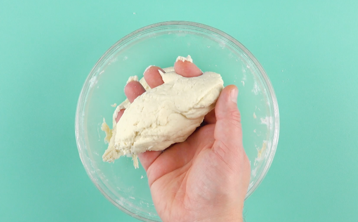 1.) Vermenge das Klebreismehl mit Mehl, Zucker, Backpulver, Butter und warmem Wasser zu einem Teig, knete diesen und forme aus ihm 2 gleich große Stücke.