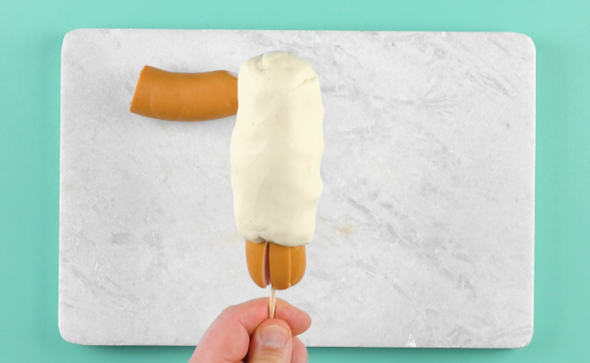 4.) Forme nun den Teig um die Spieße herum, sodass nur noch das Ende der Wurst aus dem Teig herausschaut.