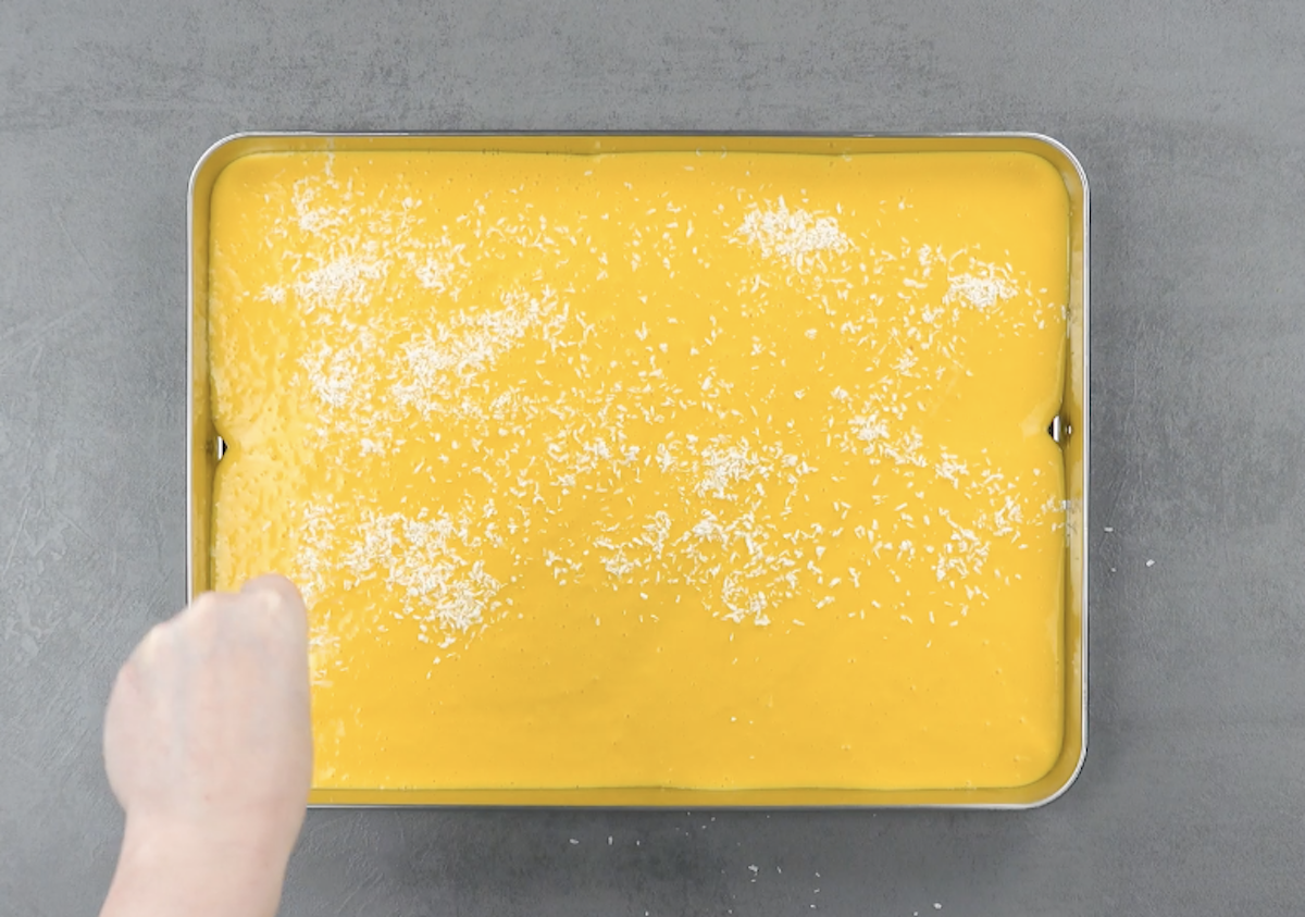 2.1 Gib Kondensmilch, Sahne, Mango und Raffaellos in einen Mixer und püriere alles miteinander. Gieße die Masse auf ein Backblech und verteile Kokosraspeln darauf. Stelle das Blech für mindestens 4 Stunden in den Gefrierschrank.