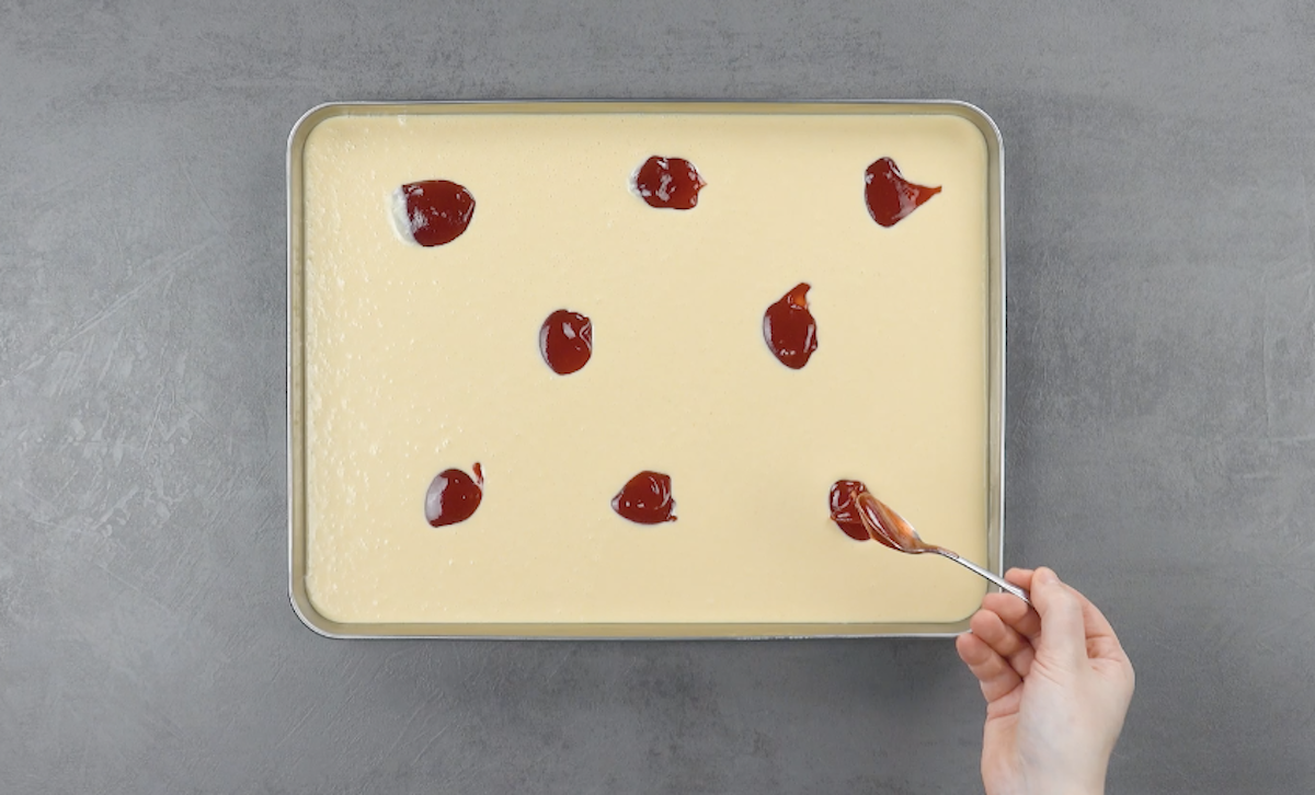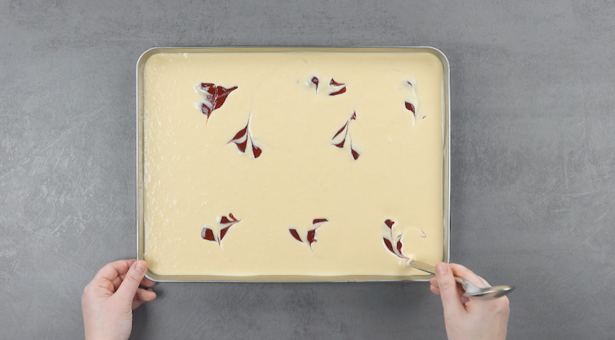 7.2 Ziehe einen Löffelstiel durch die Erdbeermarmelade, sodass ein Muster entsteht. Stelle das Backblech für mindestens 4 Stunden in den Gefrierschrank.