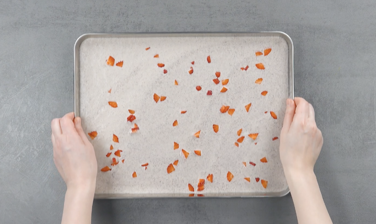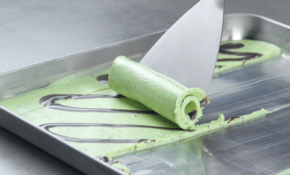 1.2 Hole das Backblech aus dem Froster und teile das fest gewordene Eis in 3 gleich große Bahnen. Rolle die Eisbahnen jeweils von unten nach oben mit einem Spatel auf, sodass kleine Röllchen entstehen.