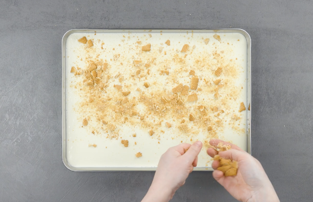 6.1 Gib Kondensmilch, Sahne, Limettenzeste und Limettensaft in einen Mixer. Gieße dann die pürierte Masse auf ein Backblech und zerbrösele Butterkekse darauf. Stelle das Blech für mindestens 4 Stunden in den Gefrierschrank.