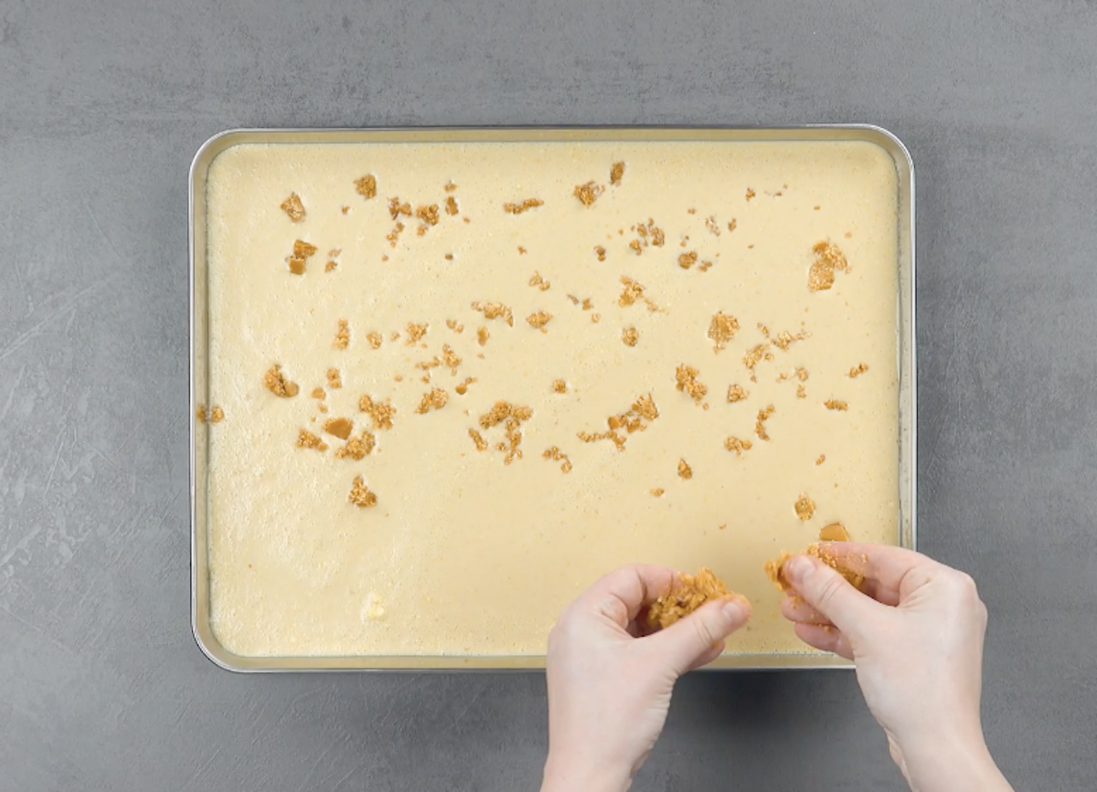 5.1 Gib Kondensmilch, Sahne, Popcorn und Karamellsoße in einen Mixer und püriere alles miteinander. Gieße die Flüssigkeit auf ein Backblech und verteile zerbröselte Karamellbonbons darauf. Stelle das Blech für mindestens 4 Stunden in den Gefrierschrank.