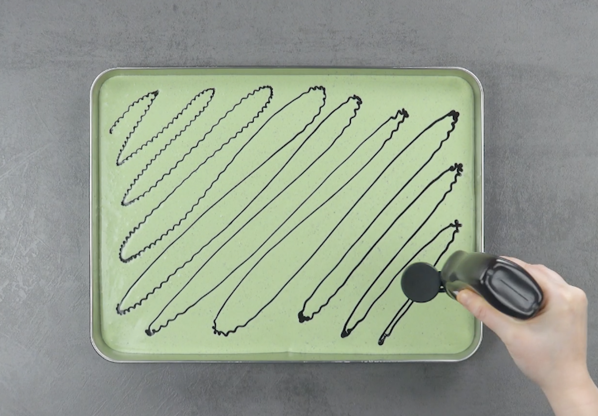 1.1 Gib Kondensmilch, Sahne, Schokodrops und Pfefferminzsirup in einen Mixer und vermische alles miteinander. Gieße die Mischung auf ein Backblech und verteile diagonal Schokosoße darüber. Stelle das Backblech für mindestens 4 Stunden in den Gefrierschrank.