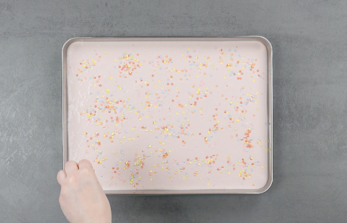 8.1 Gib Kondensmilch, Sahne und Himbeeren in den Mixer. Gieße die Masse auf ein Backblech und verteile Zuckerkonfetti darauf. Stelle das Backblech mindestens 4 Stunden in den Kühlschrank.