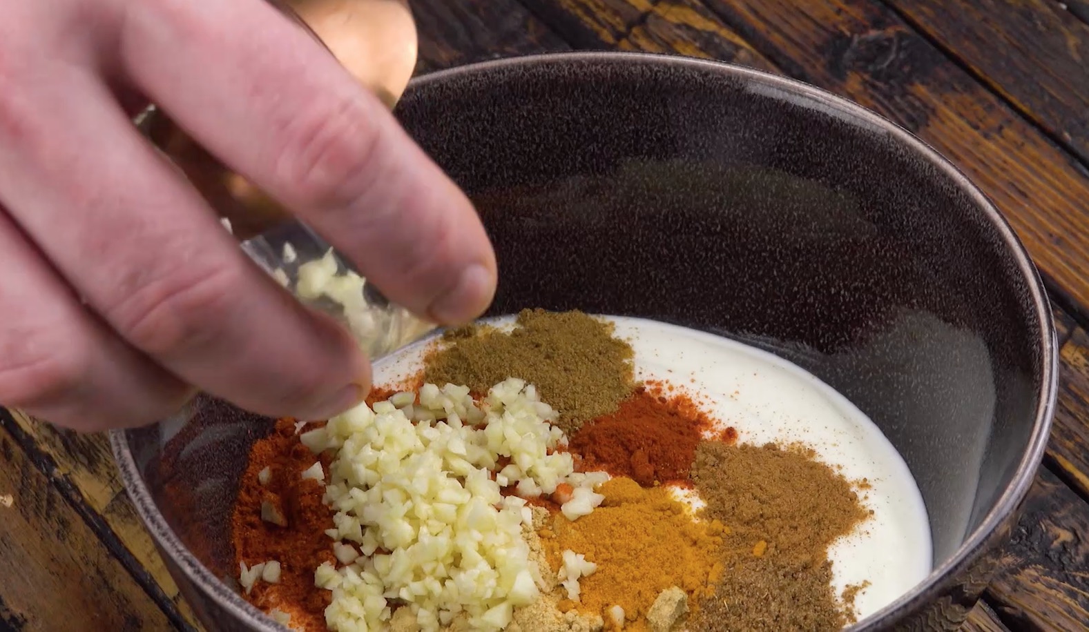 2.) Stelle nun die Marinade her, indem du alle Gewürze in das Joghurt einrührst. Lege das Hühnchen dann in eine feuerfeste Form und verteile das Würzjoghurt darauf. Das Ganze soll nun für 4 Stunden marinieren und kommt danach für 30 Minuten bei 180 °C im Umluftmodus in den Ofen.