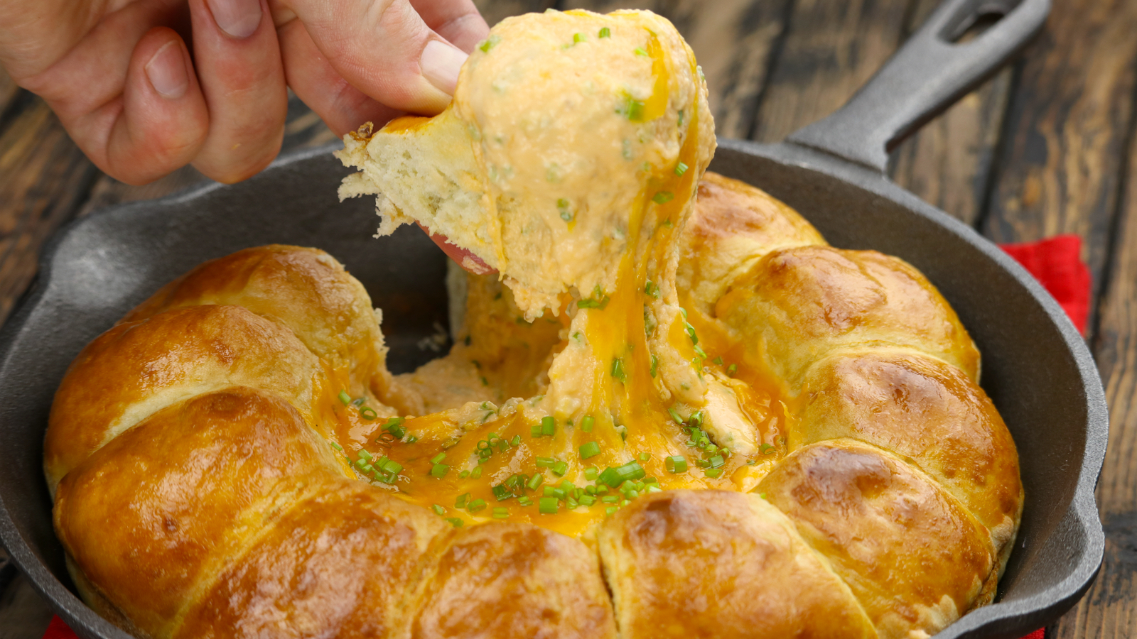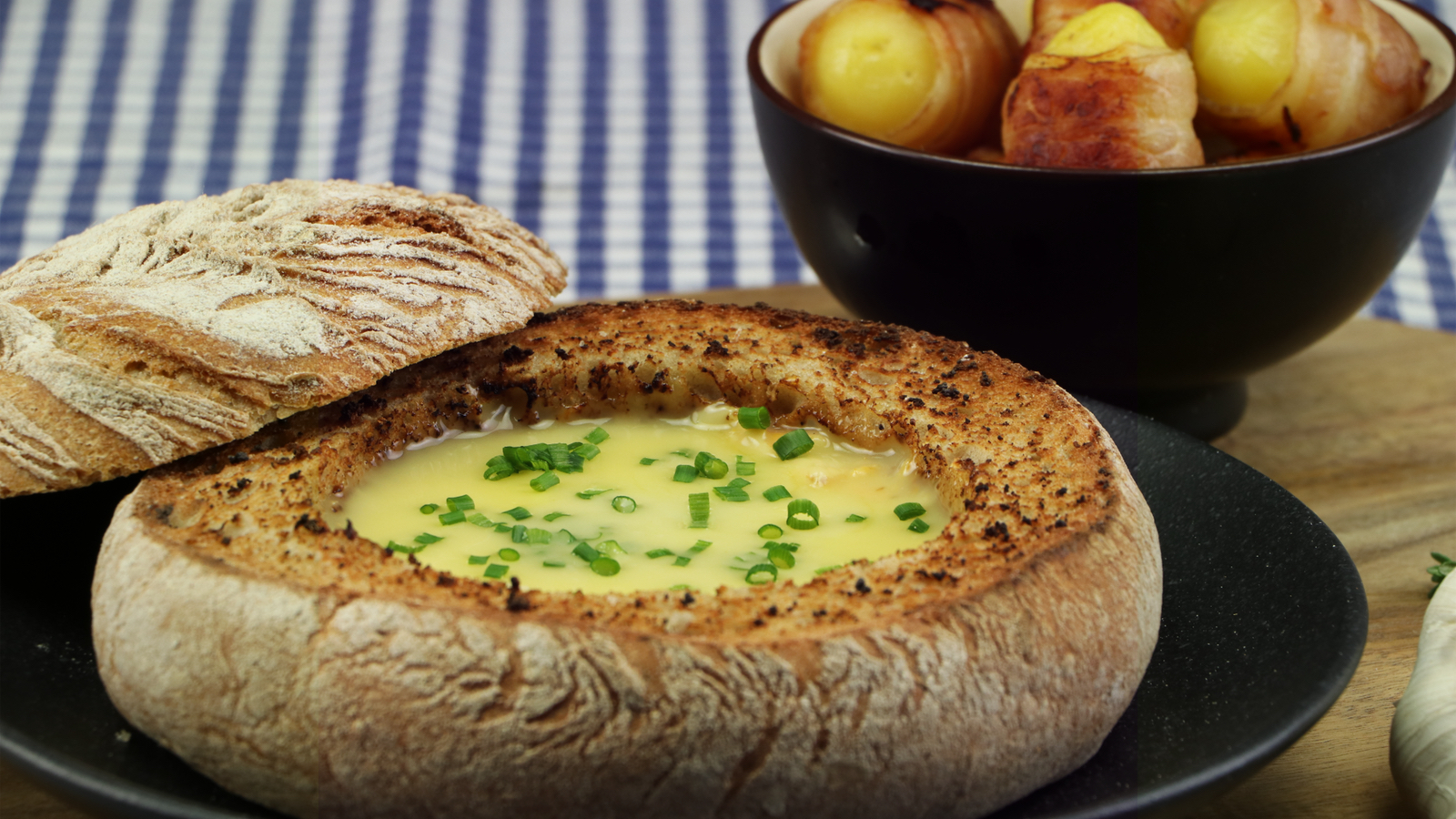 Wie du einen Laib Brot in eine Käsefondue verwandelst und in Bacon eingewickelte Kartoffeln zum Dippen zubereitest, erfährst du hier.