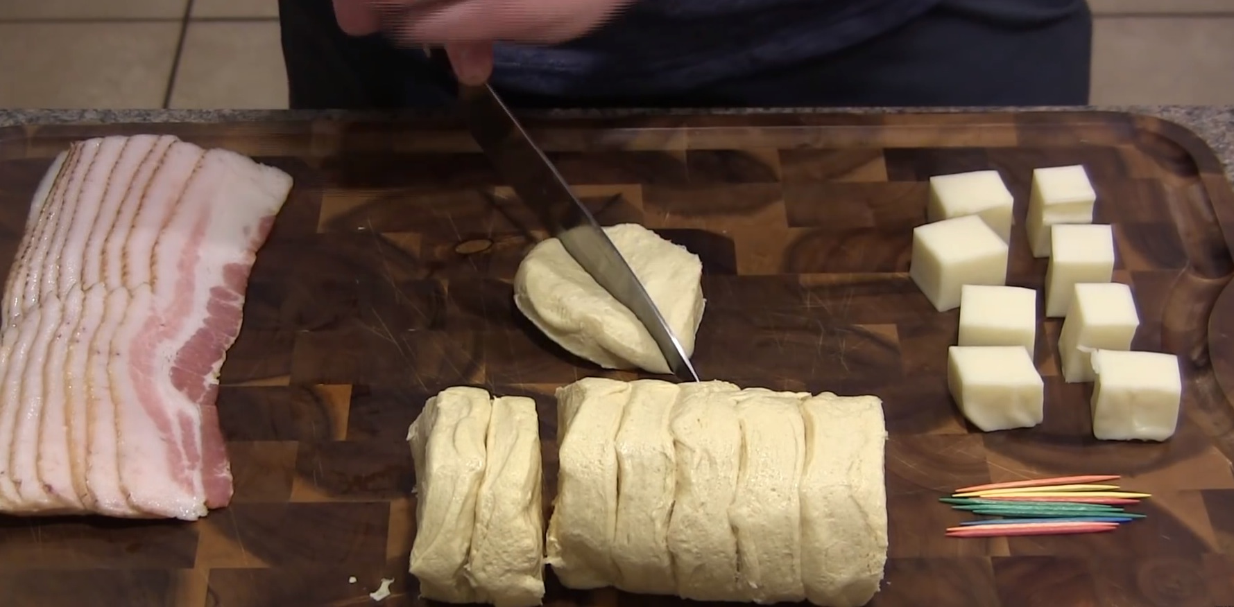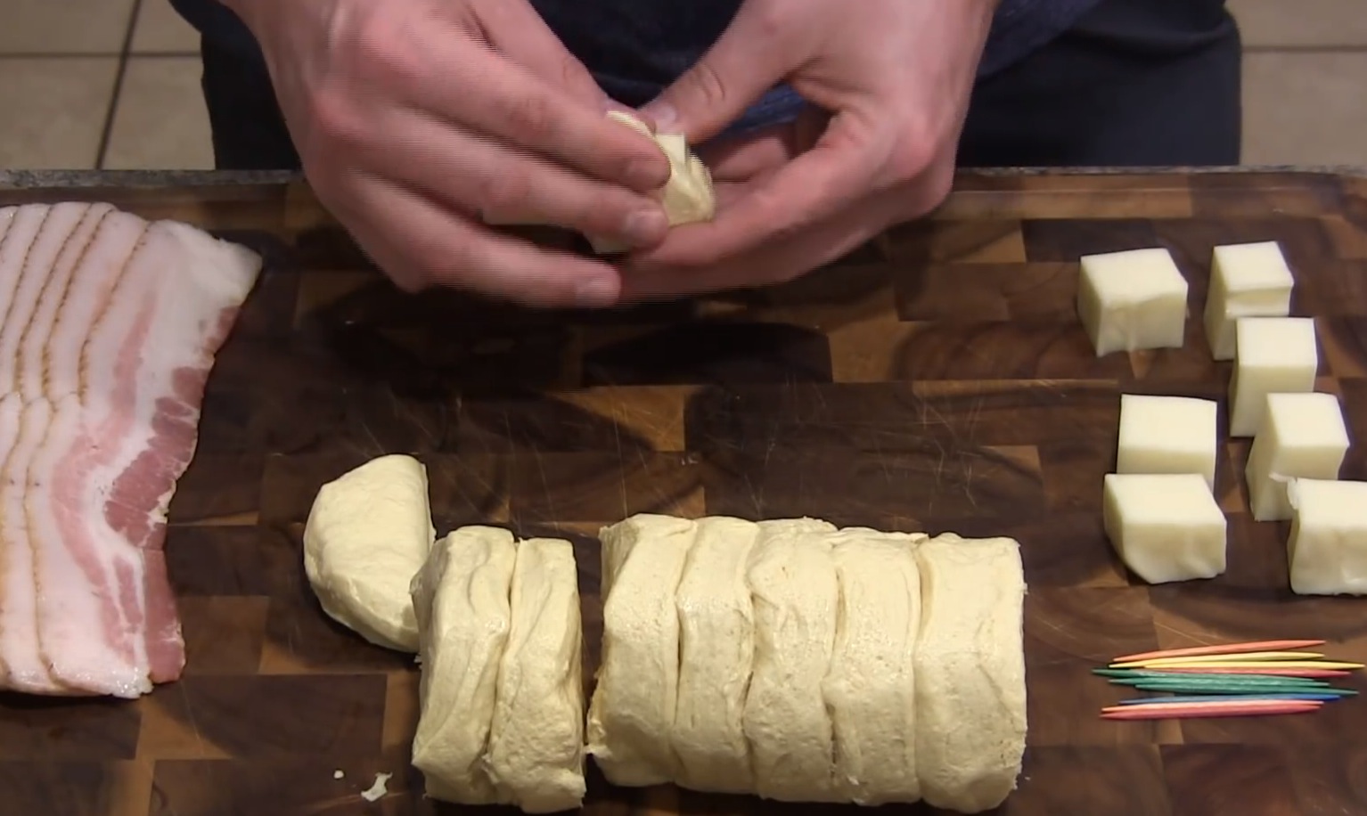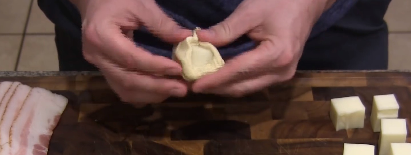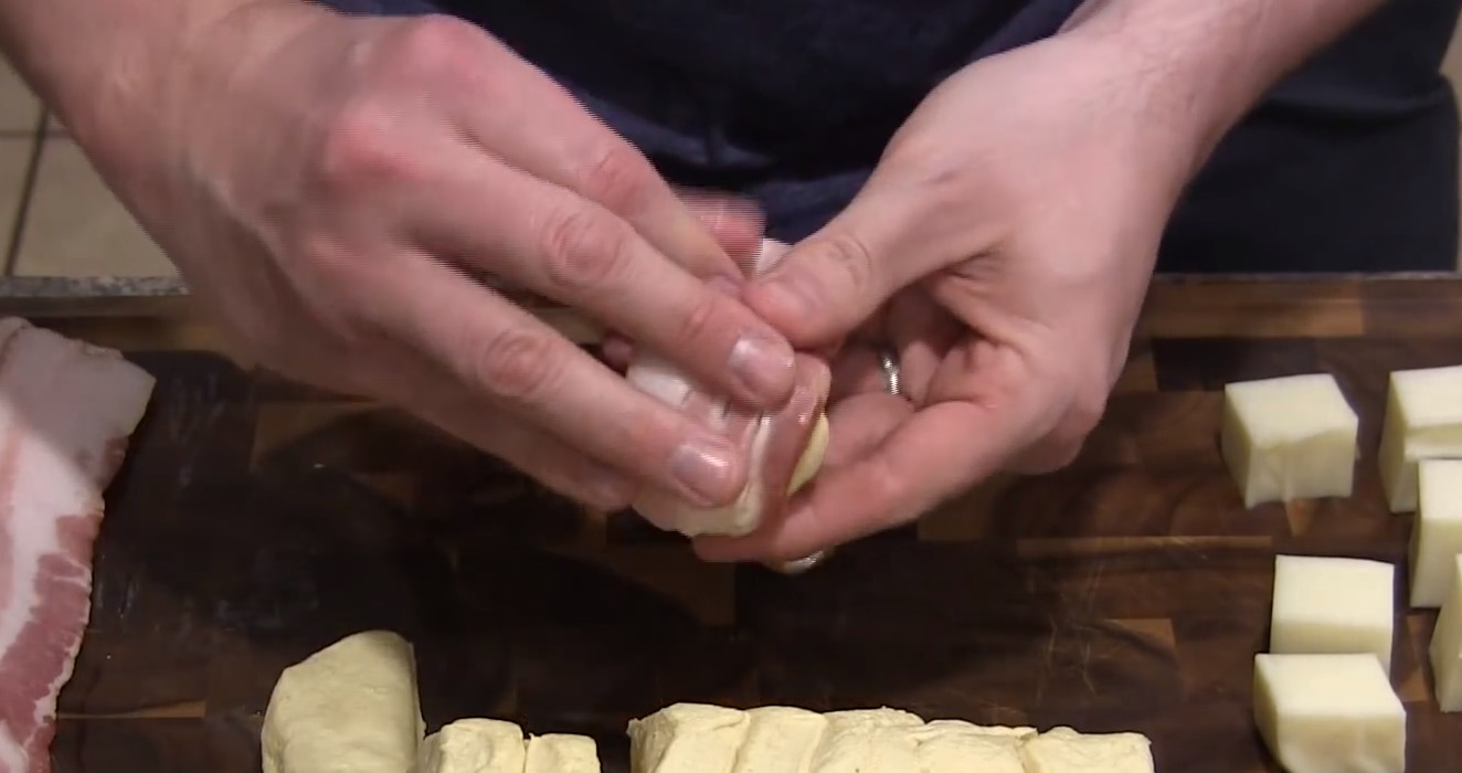Nachdem der Käse kunstvoll im Teig versteckt wurde, kommt der große Auftritt des Specks. Wickel je eine Scheibe so um die Teigkugeln, dass alle Seiten etwas abbekommen.
