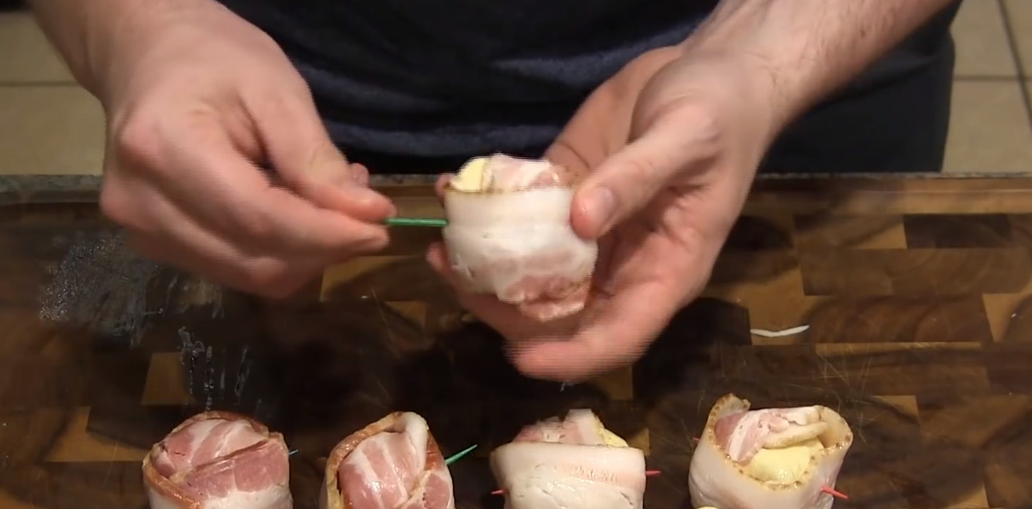 Am besten drehst du nach einer Umrundung die Wickelrichtung. So ist wirklich alles mit Speck bedeckt. Das Ganze wird dann mit Zahnstochern oder Spießchen fixiert.