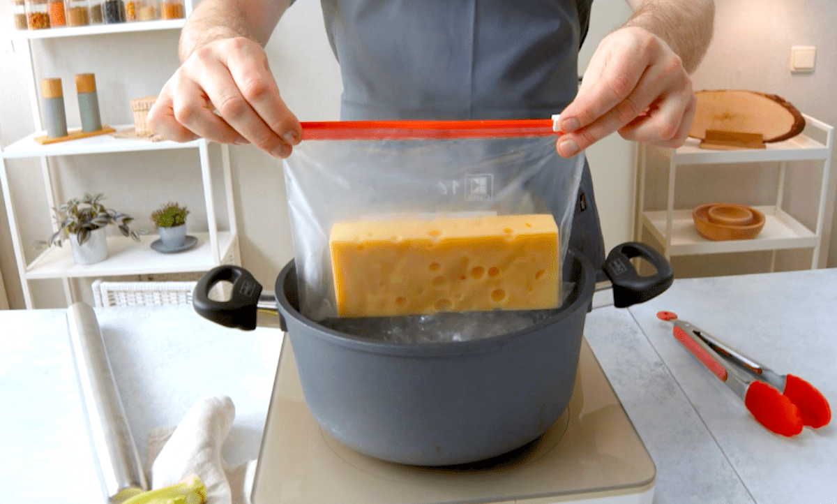 1. Lege das Stück Käse in einen Ziplock-Beutel und verschließe diesen gut. Hänge den Beutel samt Käse für ca. 30 Minuten in warmes Wasser in einen Topf (ca. 80-90 °C). Hole den Beutel aus dem Wasser, sobald der Käse weich geworden ist.