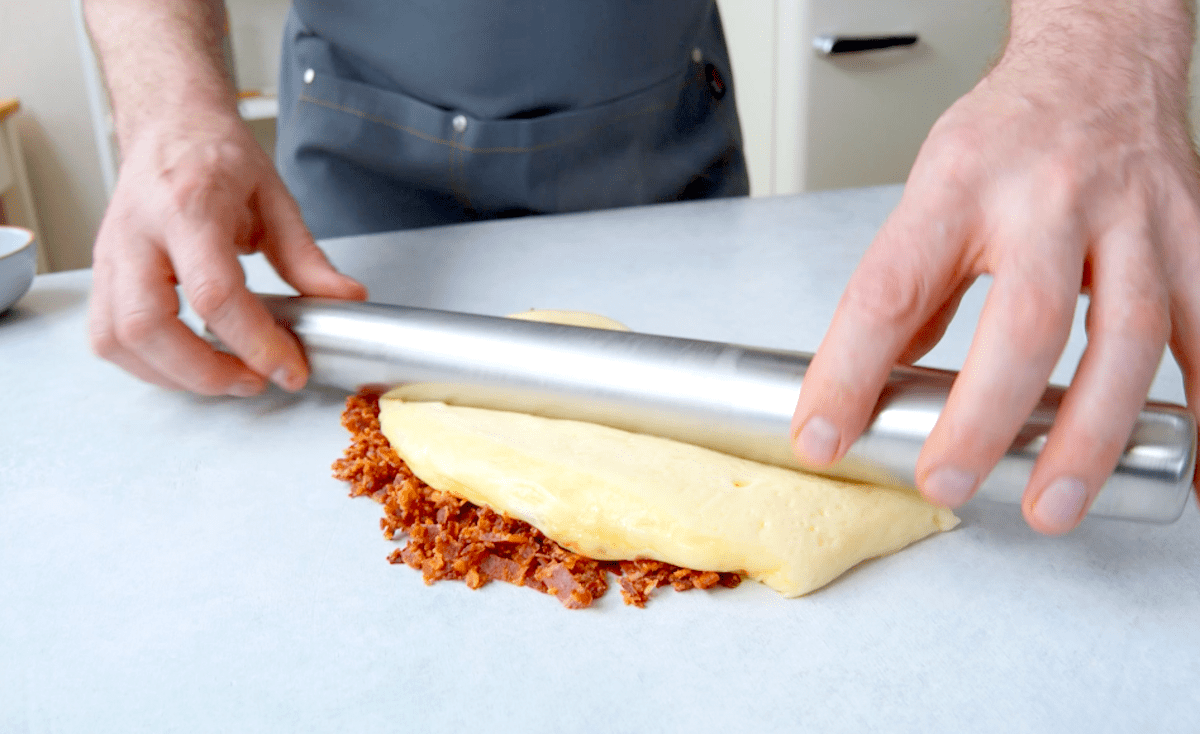 2. Verteile den klein gehackten Bacon auf deiner Arbeitsfläche und rolle den Käse darüber mit einem Nudelholz aus (empfehlenswert ist hier ein Nudelholz aus Edelstahl).
