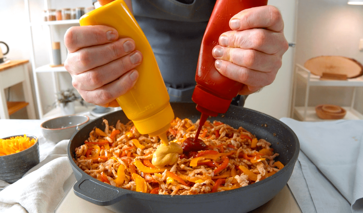 4. Brate nun das Schweinefilet in einer heißen Pfanne scharf an. Füge Paprika und Zwiebeln hinzu und brate diese kurz mit an. Zum Schluss kommen noch Senf, Ketchup und geriebener Cheddar mit in die Pfanne. Würze mit Salz und Pfeffer und vermenge alles gut miteinander. Lasse die Mischung kurz etwas abkühlen.