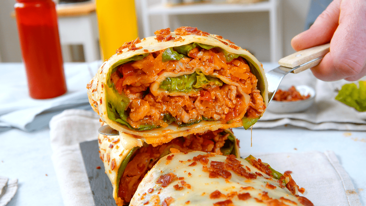 5. Verteile nun die lauwarme Fleisch-Gemüse-Füllung auf dem ausgerollten Käse und rolle alles vorsichtig zu einer Rolle zusammen.